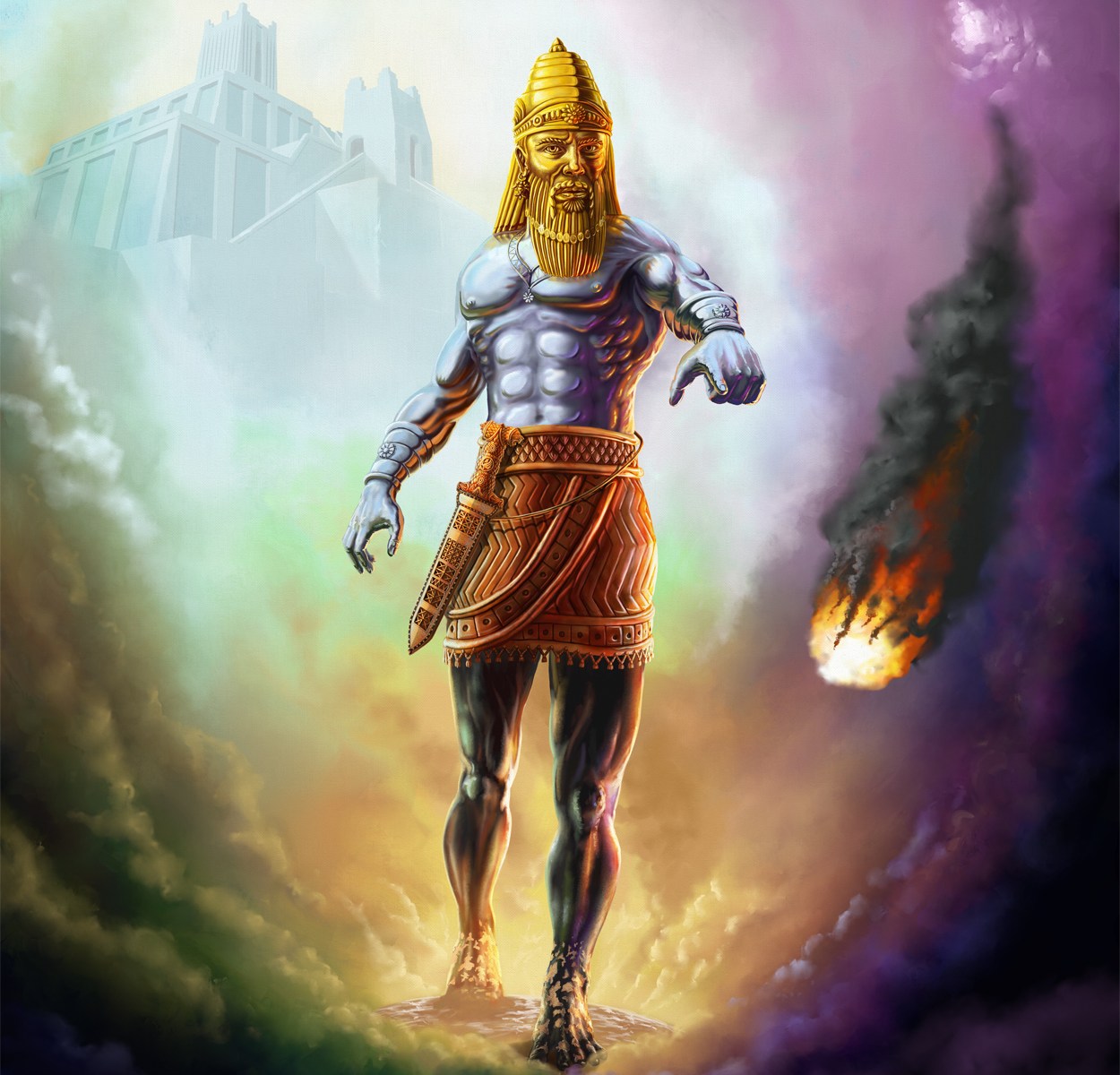 “O king, as you looked on, there appeared a great statue. This statue, which was huge and its brightness surpassing, stood before you, and its appearance was awesome. The head of that statue was of fine gold; its breast and arms were of silver; its belly and thighs, of bronze; its legs were of iron, and its feet part iron and part clay.
